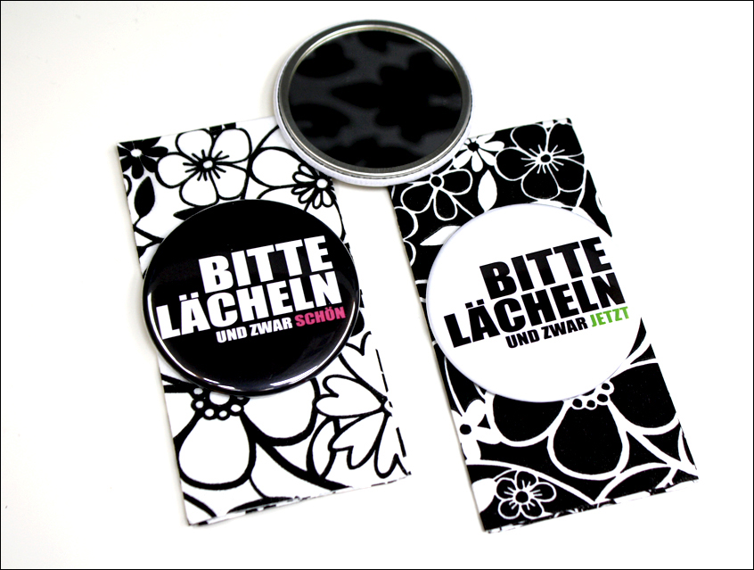 wie Nadelbutton, Flaschenöffner oder Taschenspiegel, Magnet