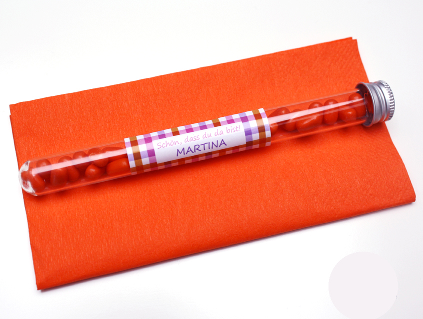 Tischkärtchen-Tüten mit Aufklebern. Und auch die